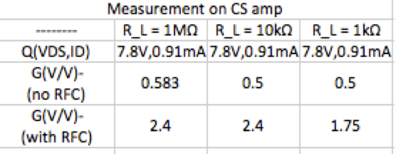 To understand the benefit of the choke/RF amplifier, we first build the CS amplifier and observe its results. Once the circuit is built the Q-point and gain for the 1MΩ, 10kΩ, and 1kΩ resistor are recorded. This can be compared to the Q-point and gains with the RF amplifier once it is built. A summary of this comparison is seen below in Table 1. After that the choke and making the RF amplifier, the RF amplifier is further analyzed. The analysis shows that the load resistance can change with out changing the gain. The data for this analysis is in Table 2. This lab shows how the RF amplifier will be chosen for the radio instead of the simple CS amplifier that has verifying gain by load resistance.